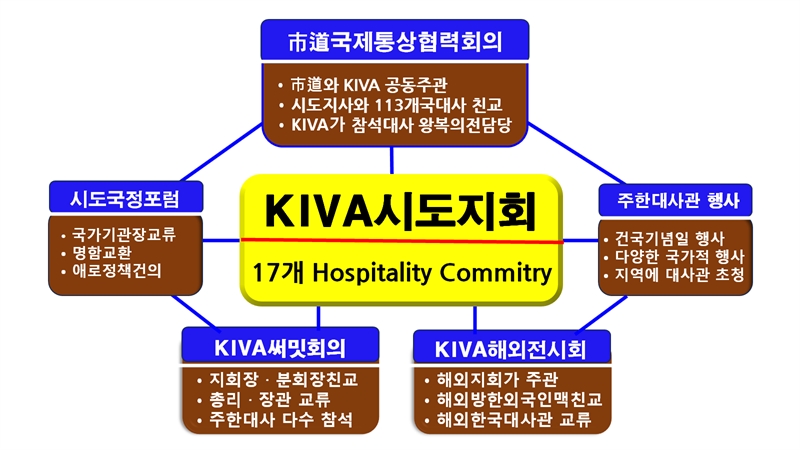 KIVA 회원기업은 ①전국적으로 2600여개 기업이 상호연대하며 활동하고, ②113개 주한외국대사관과 Korean Supporters로 친교하며, ③시도지사와 113개 주한외국대사를 결합시키고, ④지역내 국가기관장과 매월 국정포럼에서 친교하고 ⑤125개 해외도시별 해외지회가 매년 주관하는 해외전시회에 참가하는 등 그 참여