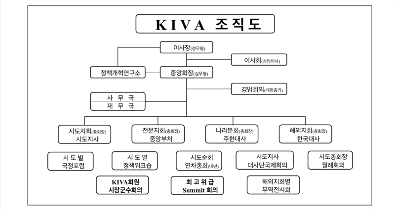 o 이사장은 정무형으로서, 2600여 회원기업을 대표하며, 주한외국대사와 중앙부처 및 시도지사의 공공외교 프로그램 협력주체로서 활동함. o 중앙회장은 실무형으로서 정부행정 경험자가 맡아, 모든 중앙행정기관과 전국의 지방행정기관을 아우르면서 KIVA가 설립목적에 맞게 자리매김되도록 실무를 총괄함 o 정책개혁연구소는 대