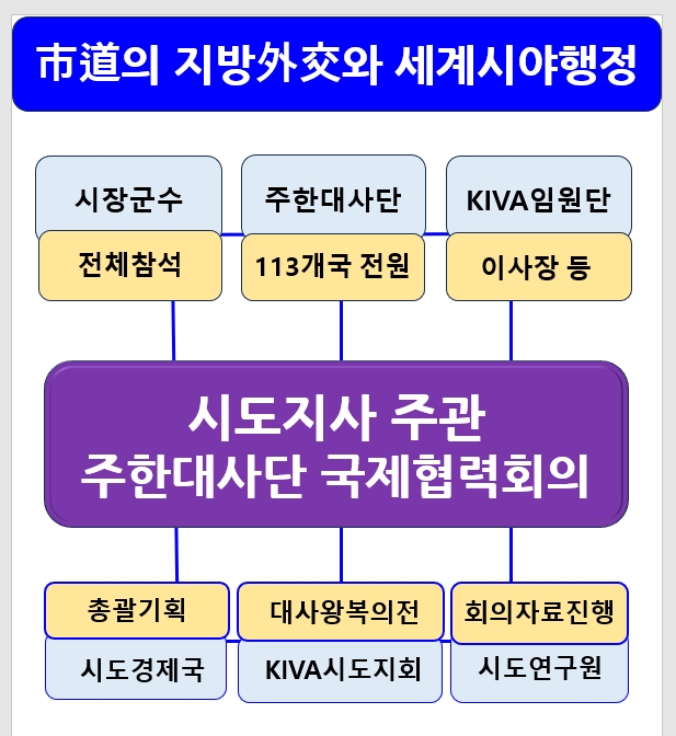 o 市道지사가 주한대사관 113개국 모두를 초청하여 '국제통상협력회의'를 개최하게 된다면, 그 국제회의는 한국사회 최초로 市道단위에서의 주한외교대사단 전체회의가 되면서, 지방자치단체의 국제행정 역량을 획기적으로 확대하는 대형 국제회의가 될 것임. -그간은 大使단 일부(15~35여개국)를 초청하여 이벤트 행사 또는 市