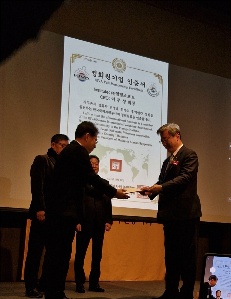 주영섭 중앙위원장의 KIVA 1호 정회원 기업 인증서 수여식 (주식회사 엠엘소프트 이무성 회장)
