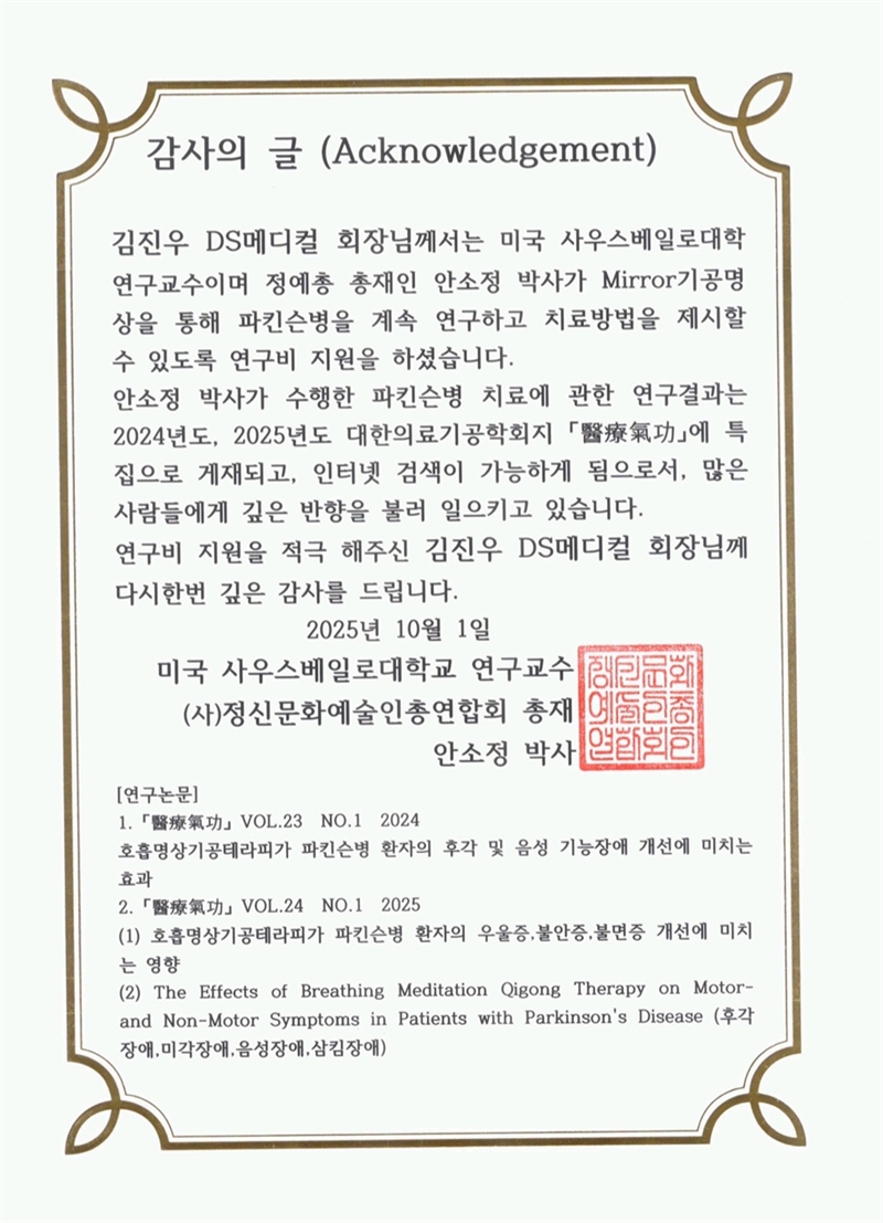 (2) 의료기공 (VOL.24, NO.1, 2025) 호흡명상기공테라피가 파킨슨병 환자의 우울증,불안증,불면증 개선에 미치는 영향 2편이다