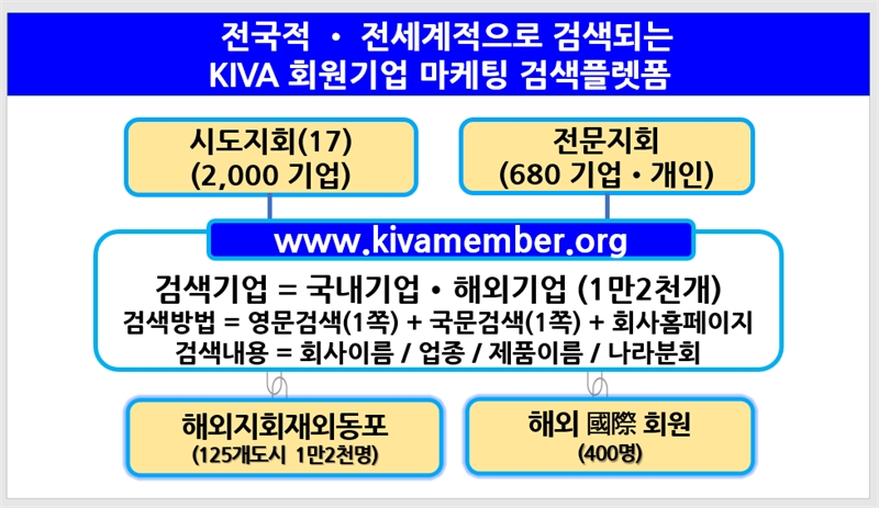 KIVA 중앙회가 계획중인 '회원기업검색플랫폼'이 완성되면, 전국적 전세게적으로 KIVA 회원기업들은 서로간에 쉽게 소통하고, 해외 잠재바이어들도 언제 어느때든 쉽게 회원기업의 상품과 서비스를 파악할 수 있음